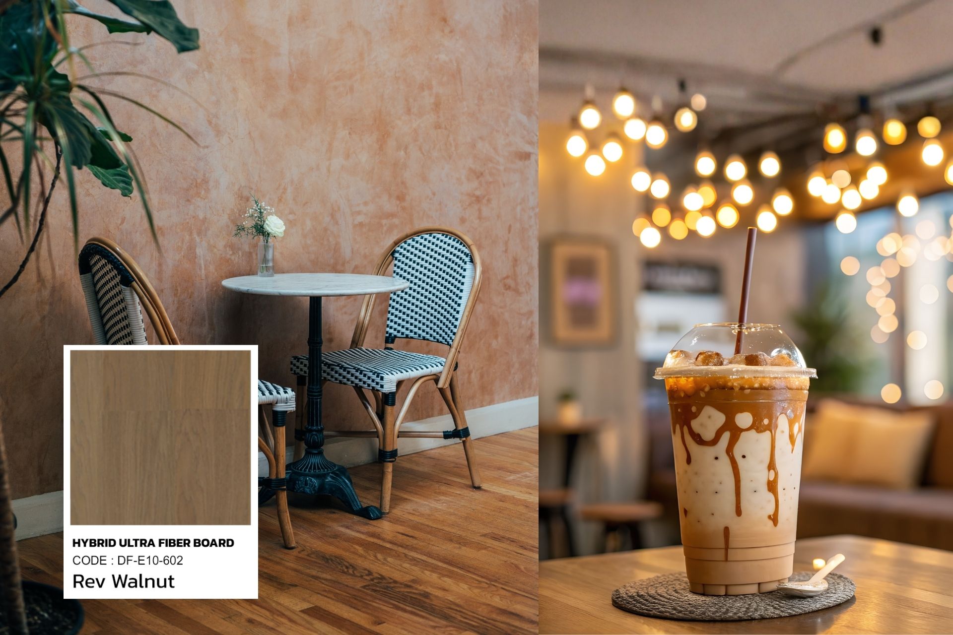 คาเฟ่ต้องการ Mood & Tone ที่ชัดเจน เพราะเป็นจุดขายสำคัญ พื้น MFB ลายไม้ธรรมชาติ เช่น Oak Blonde, Rustic Wood หรือโทนอบอุ่นแบบ Honey Oak จะช่วยสร้างบรรยากาศร้านได้ดีมาก