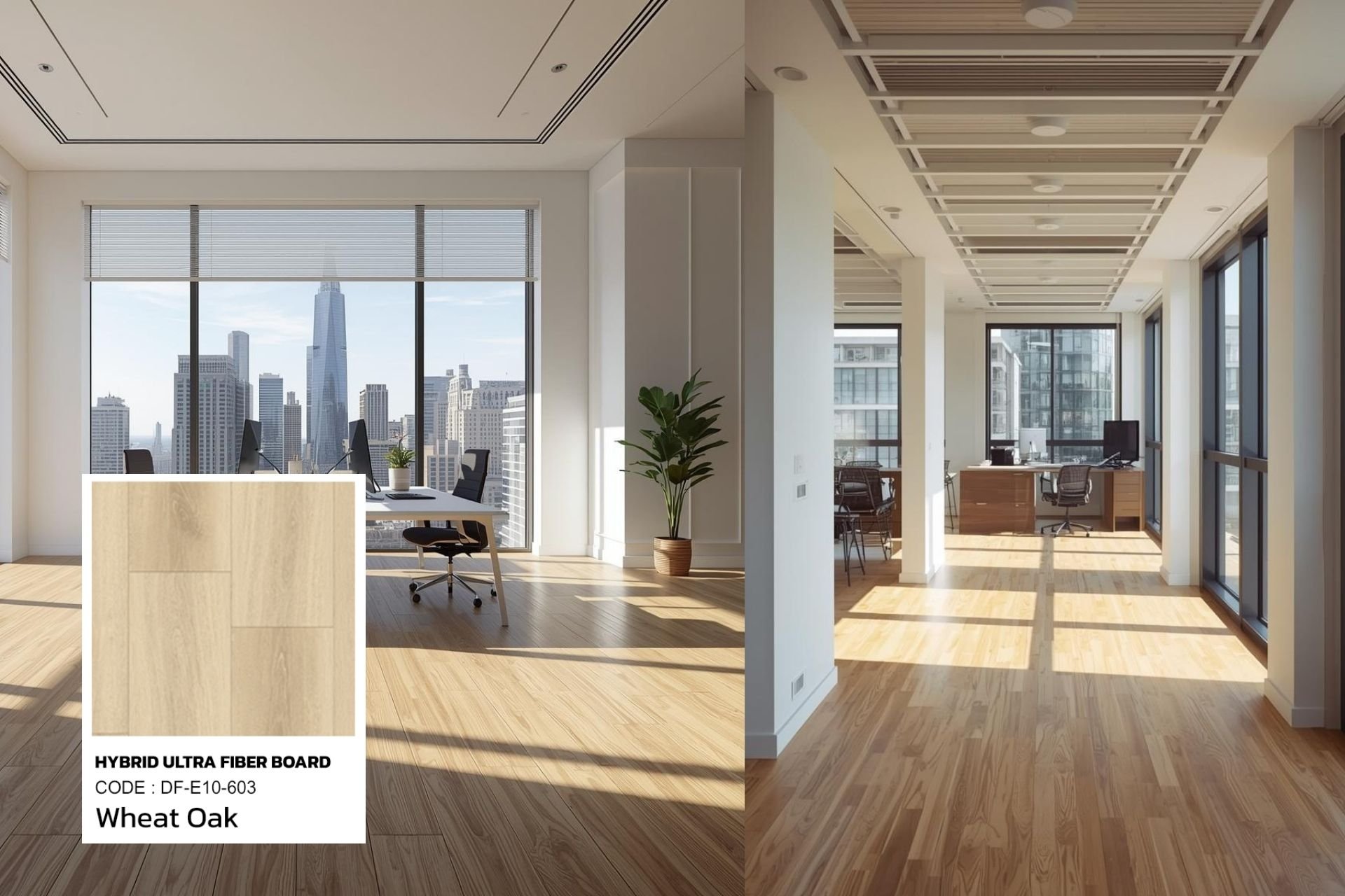 ออฟฟิศสมัยใหม่เน้นดีไซน์ที่สะท้อนตัวตนแบรนด์และช่วยเพิ่ม Productivity การใช้พื้น MFB สีเข้มอย่าง Walnut หรือ Smoke Oak จะสร้างความรู้สึกหรูและมั่นคง